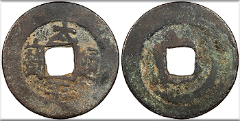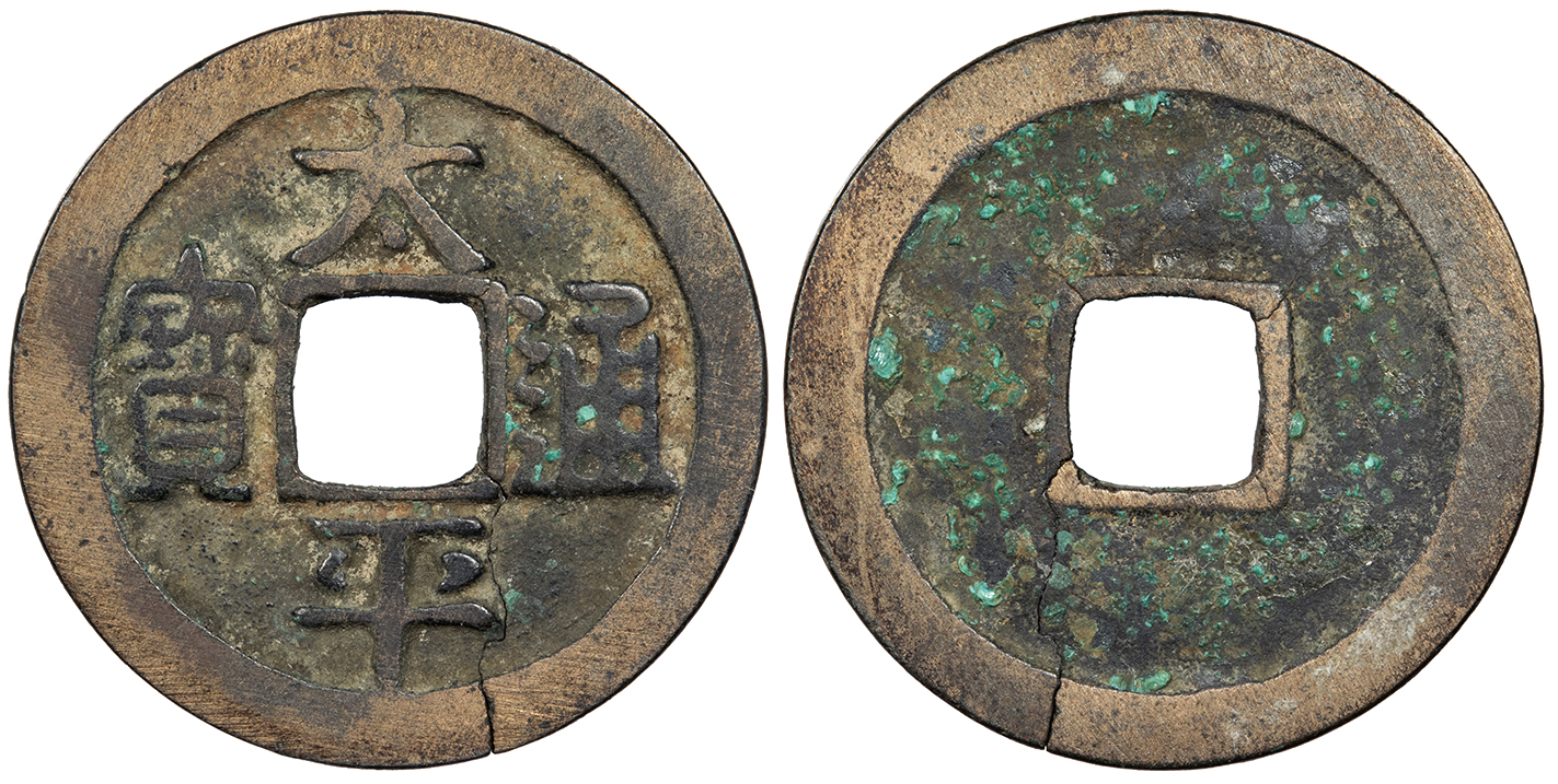 AE Cash 24mm. 2.94g. 976-989 A.D. Four Chinese characters Tai Ping Tong Bao Dot at top center.