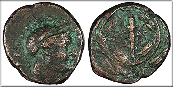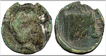 AE9 9mm. 1.00g. Head of Herakles, r. wearing lion skin headdress.