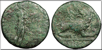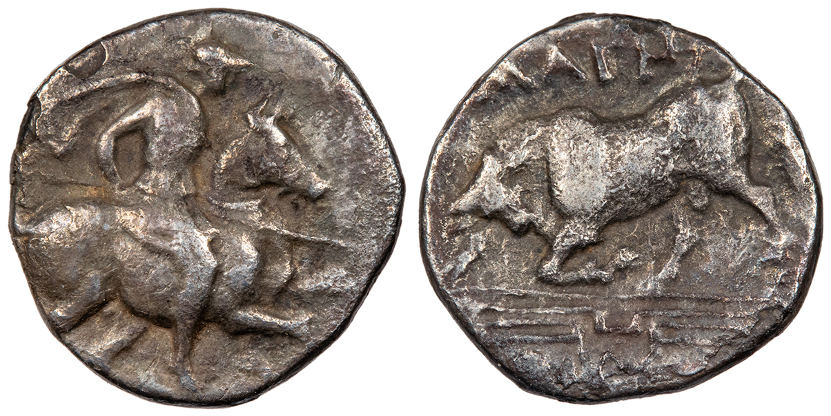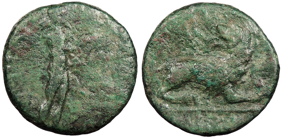 Bull butting l. on maeander pattern, ear of grain behind; MAGN above; In ex.: [NISAIOS]