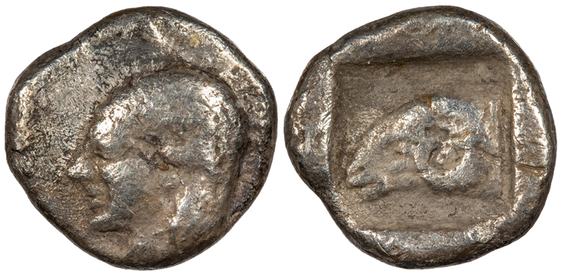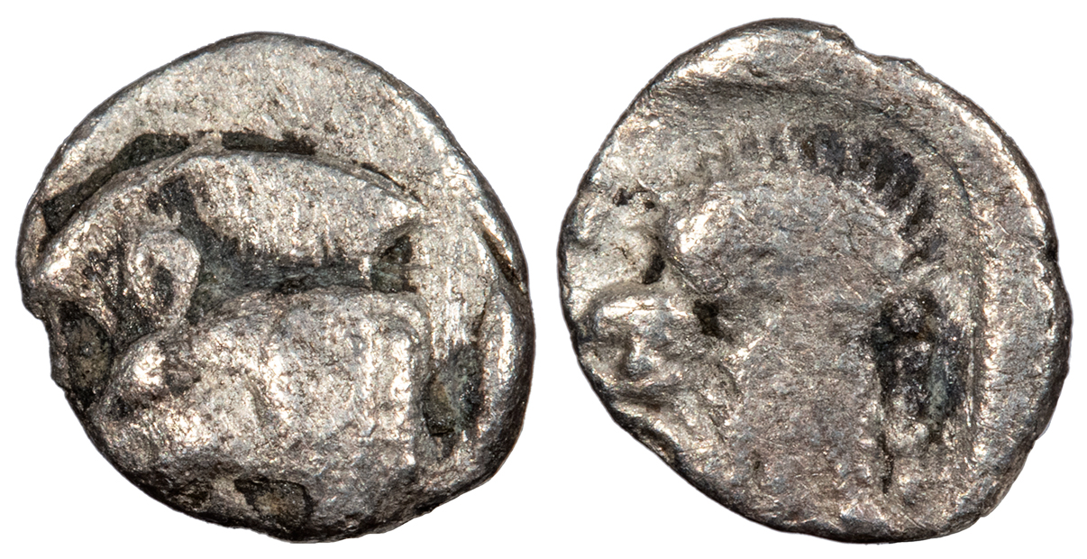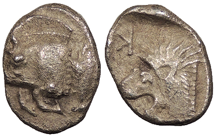 AR Tetartemorion 8mm. 0.19g. Forepart of boar l., retrograde K on shoulder, tunny fish behind.