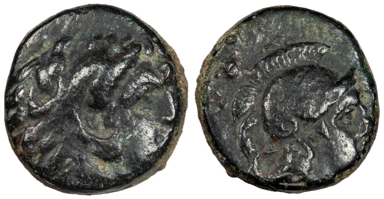 Helmeted head of Athena, r.; [PER] below.