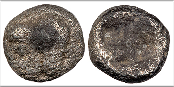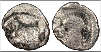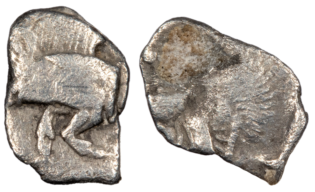 AR Obol 10mm. 0.80g. Forepart of boar l., tunny fish upwards behind.