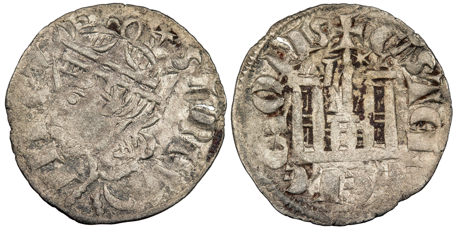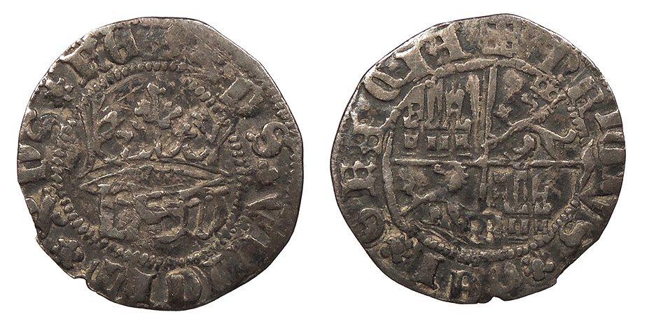 Bi Coronado 19mm. 0.71g. Burgos Mint. Crowned bust left. SANC II REX 'Castle' of Castille and Leon. +CASTEL-LE LE -GIOnIS Cayon 1127 VF. Light toning. Small flan void.