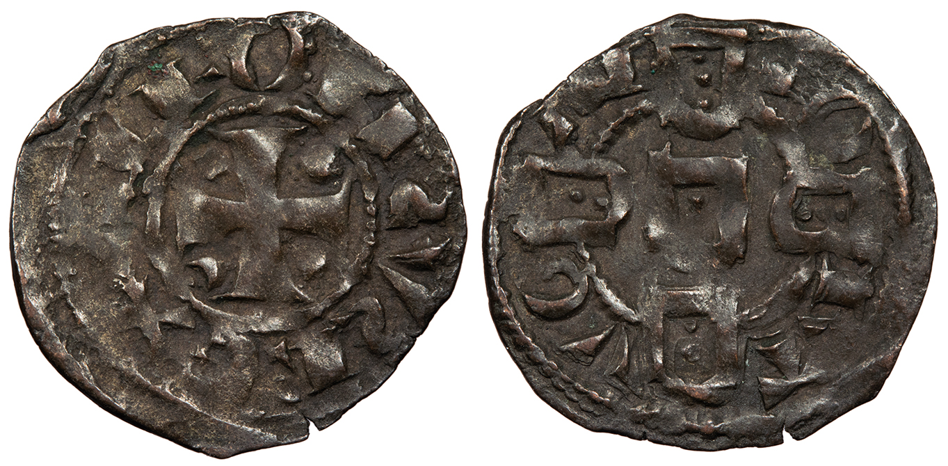 Bi Dinheiro 18mm. 0.82g. Cross Pattée; quartered with crescent and star.