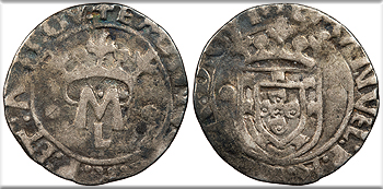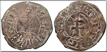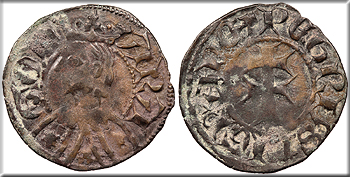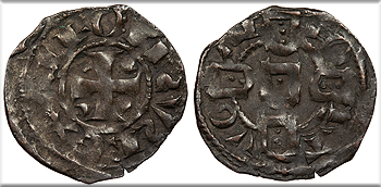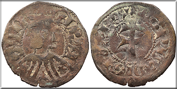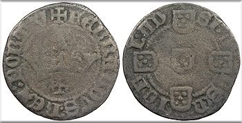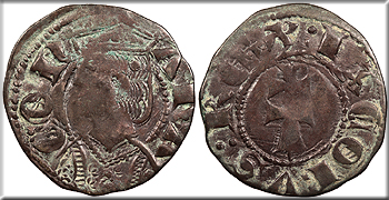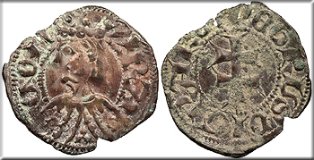 Bi Pilarte Coroado (7 Dinheiros) 20mm. 1.15g. Lisboa Mint. 1371-1383 Crown above small cross pattee.