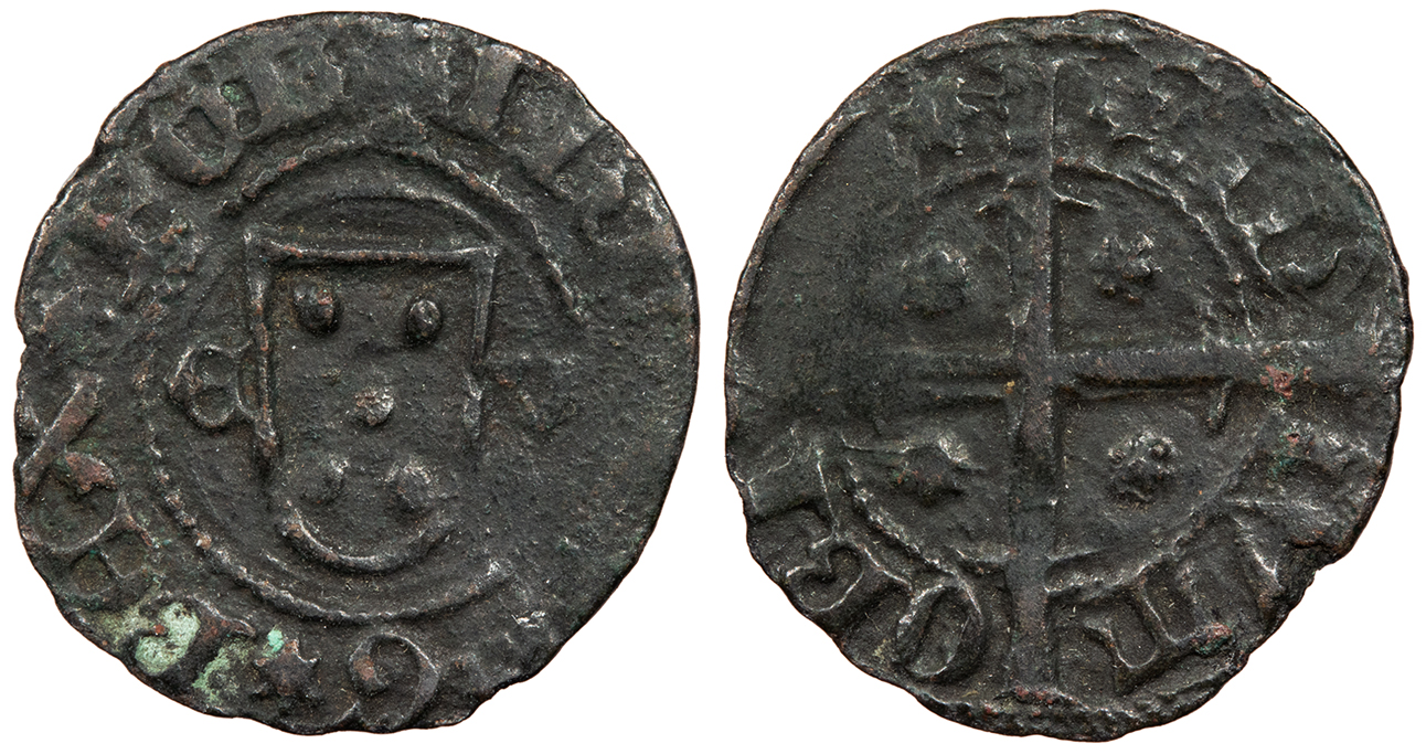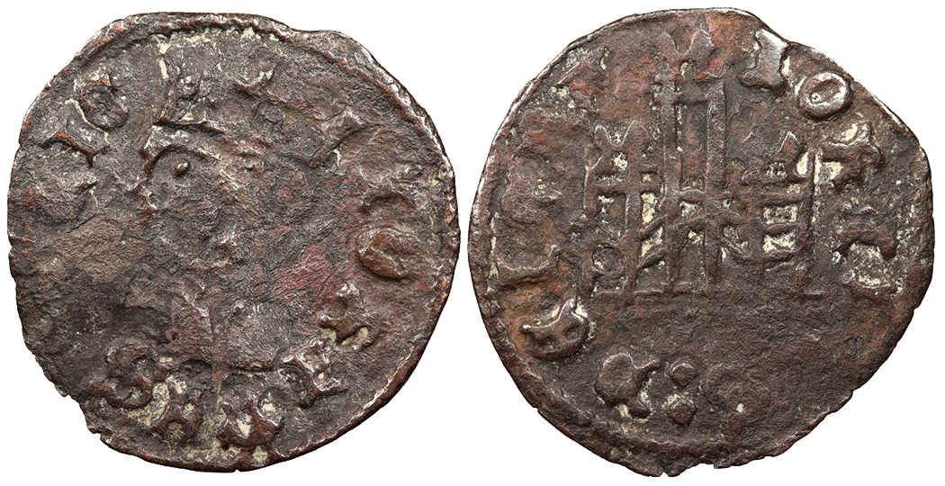 Bi Blanca (2 Cornados) 23mm. 1.65g. Sevilla mint, mintmark: S Lion rampant left. +ENRICVS: REX: LEGIO Castle with three towers; mintmark below. +ENRICVS: REX: CAST: Cf. Heiss 26-27; cf. Cayon y Castan Tipo 4-5, 1448 & 1452 VF. Glossy brown patina. Appears to be a full blanca (same design), with the legends of a half blanca. Unlisted in C&C and Heiss.