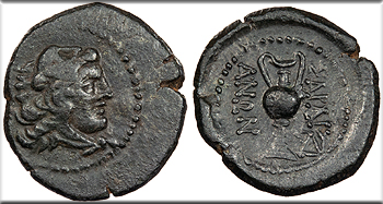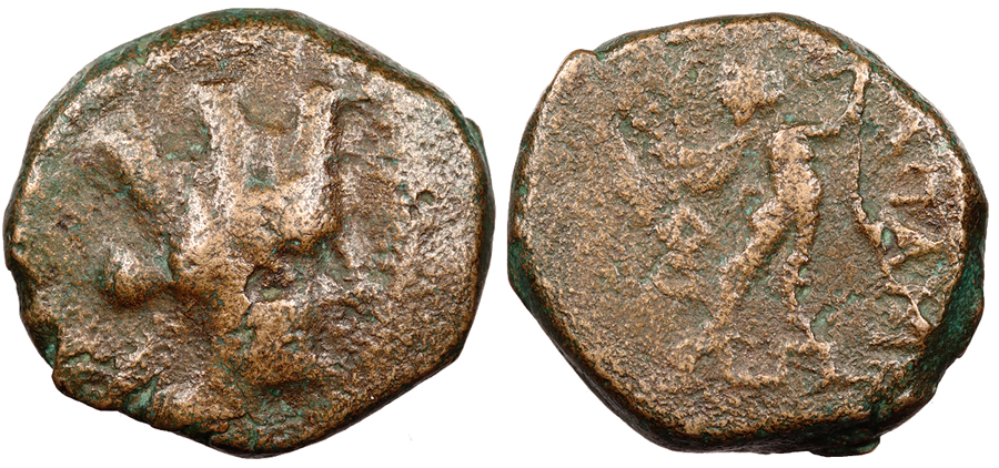 cf. BMC Ionia 111 Near VF. Rare. Green patina. Some minor roughness. The magistrate’s name is incomplete but appears to match the SAMIOS name noted in BMC. We could find no examples of this name sold at auction.