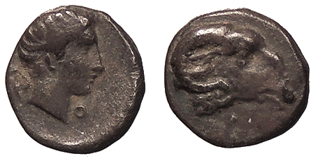 AR Hemiobol 7mm. 0.40g. Youthful male head r.; Carian legend at bottom.