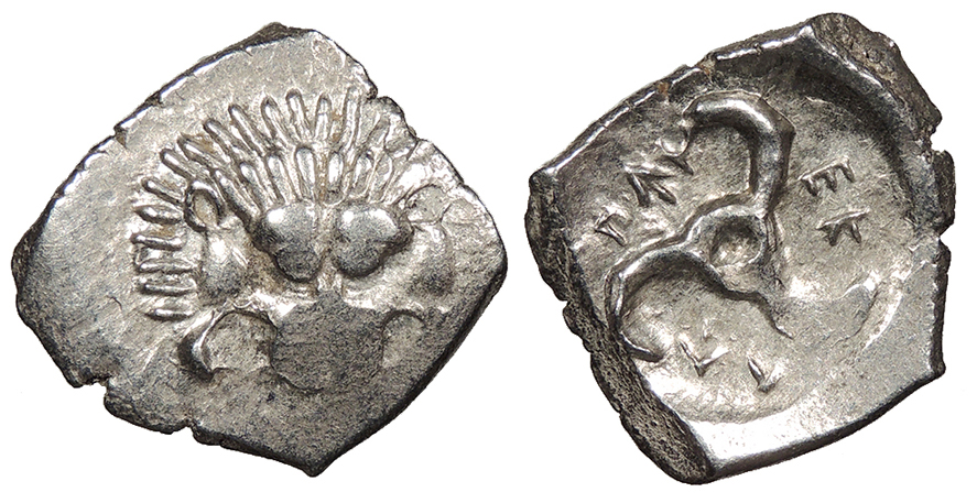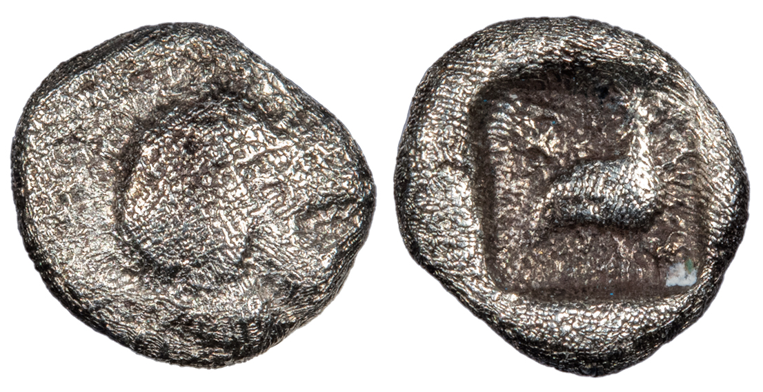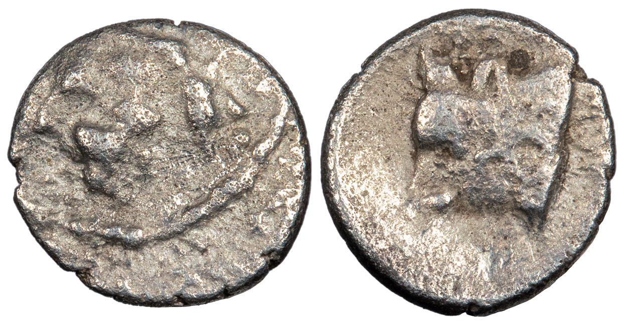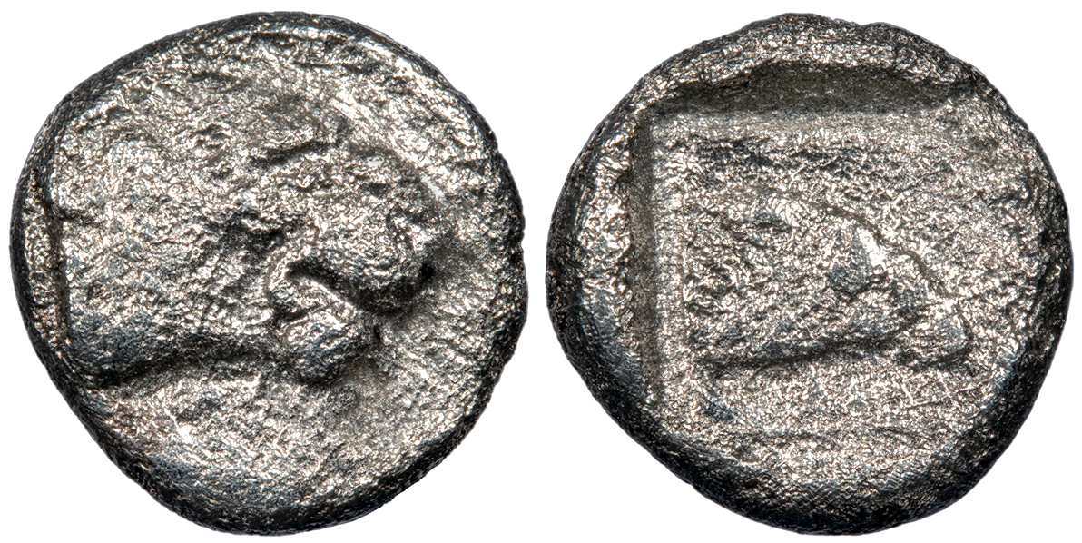 AR Tetartemorion 6mm. 0.25g. Forepart of lion l., head reverted to r.