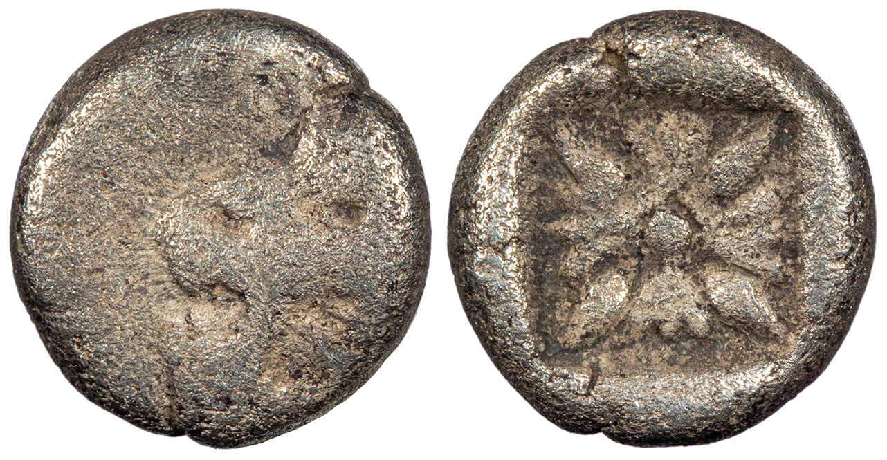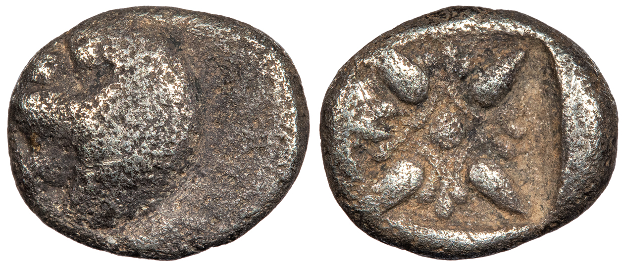 Bird r., pellet in top l. and bottom r. corners of incuse square.