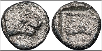 AR Obol (or diobol) 9mm. 1.05g. Forepart of lion r., head reverted to l.