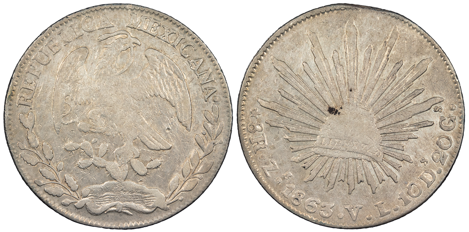 AR 8 Reales 39mm. 26.63g. Zacatecas Mint. Assayer V.L. Eagle standing left on cactus, head reverted; devouring snake; floral sprays below.