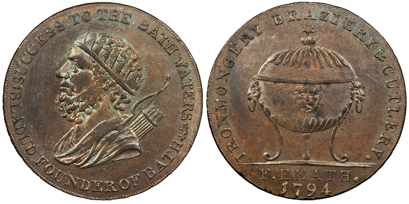 Somersetshire AE Halfpenny Token 29mm. 9.99g. Conder Crowned and draped bust left, with bow and quiver at shoulder. SUCCESS TO THE BATH WATERS / BLADUD FOUNDER OF BATH Tea urn with lion face. IRONMONGERY BRAZIERY & CUTLERY . / F. HEATH . D&H 39 UNC     Satin lustre. Edge: PAYABLE BY F. HEATH BATH