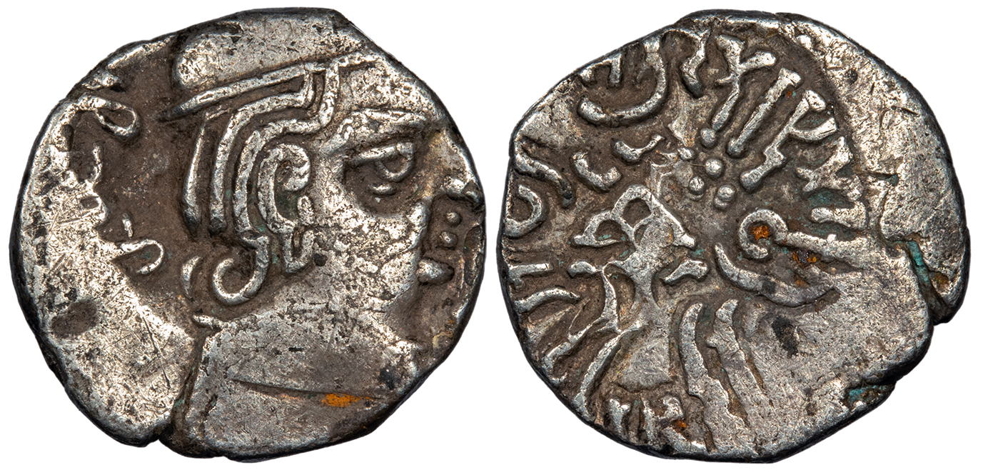 AR Drachm 15mm. 2.60g. Saka Era 215 (293 A.D.) Head of Rudrasena III r., wearing satrapal cap, moustache and earring; behind, date in Brahmi numerals; around, blundered legend in Greek.