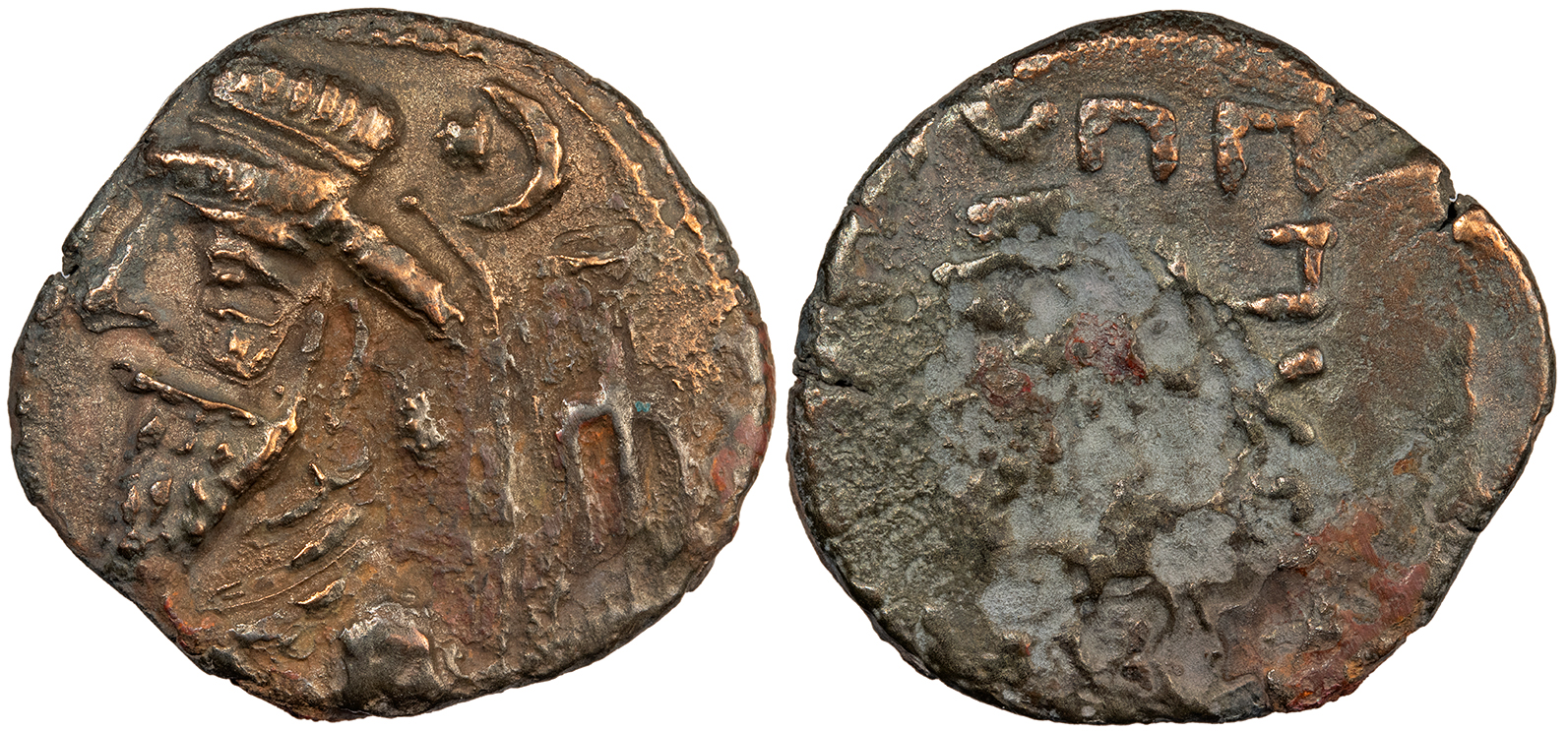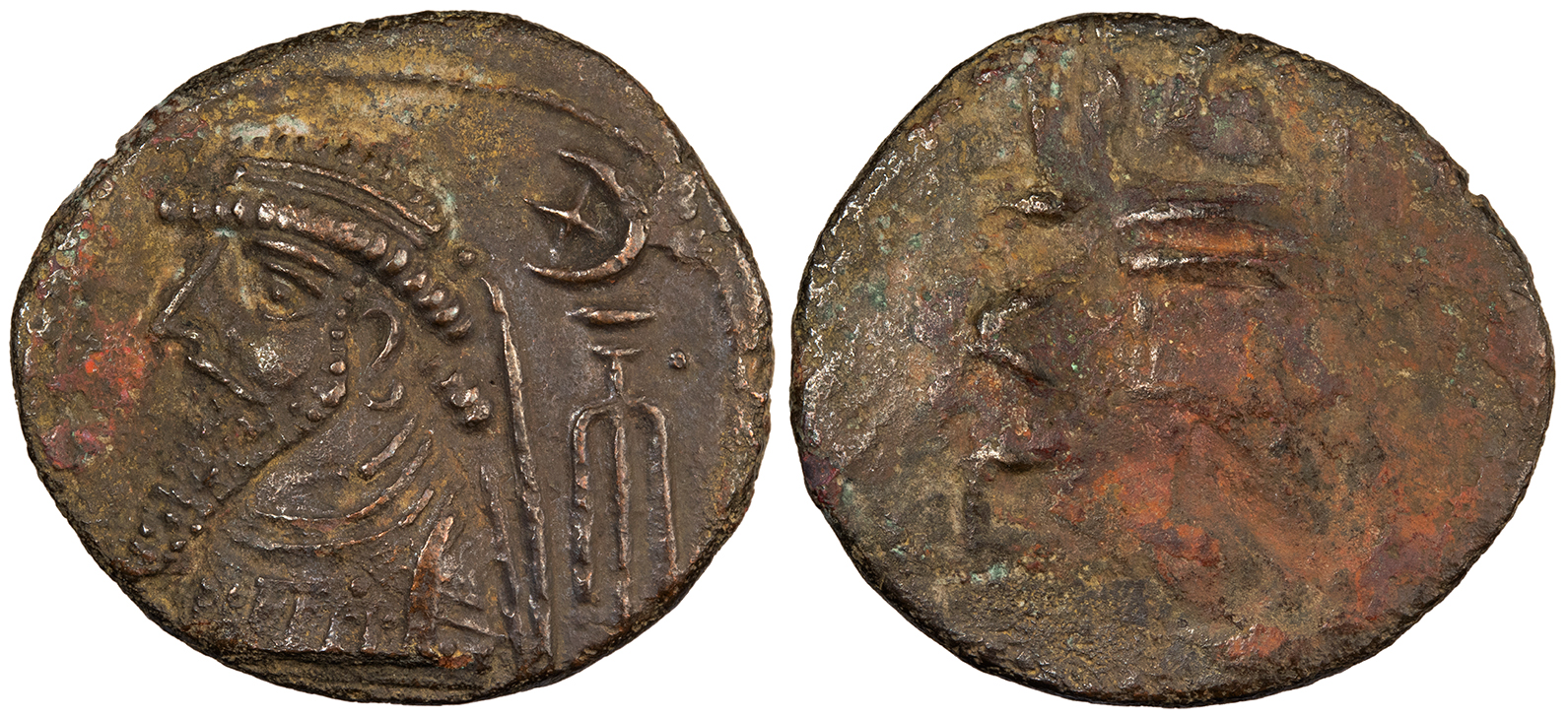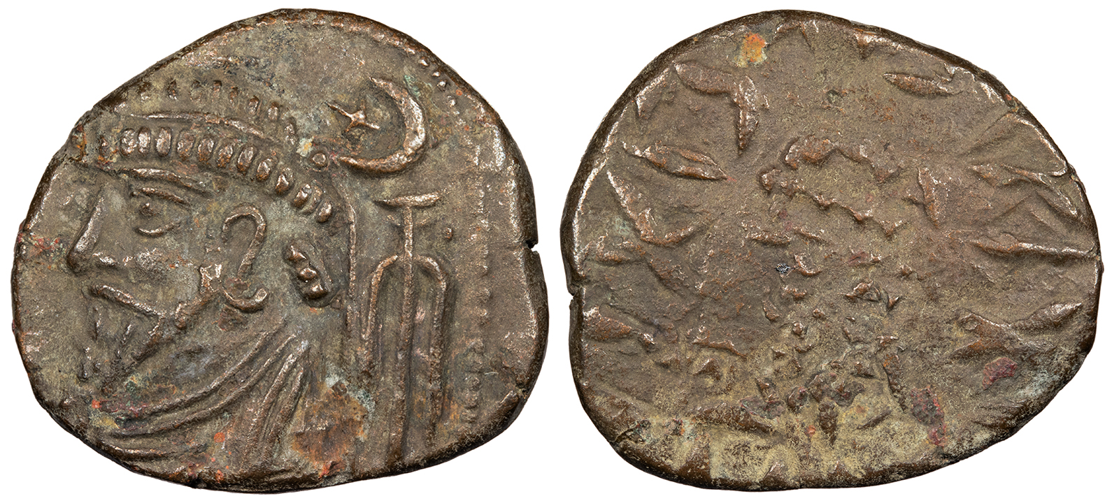 AE Tetradrachm 27mm. 13.70g. Bust l. with long pointed beard and hair dressed in curved pattern down neck, tuft of hair bound with diadem; star in crescent above anchor to r., pellet to r. of anchor.