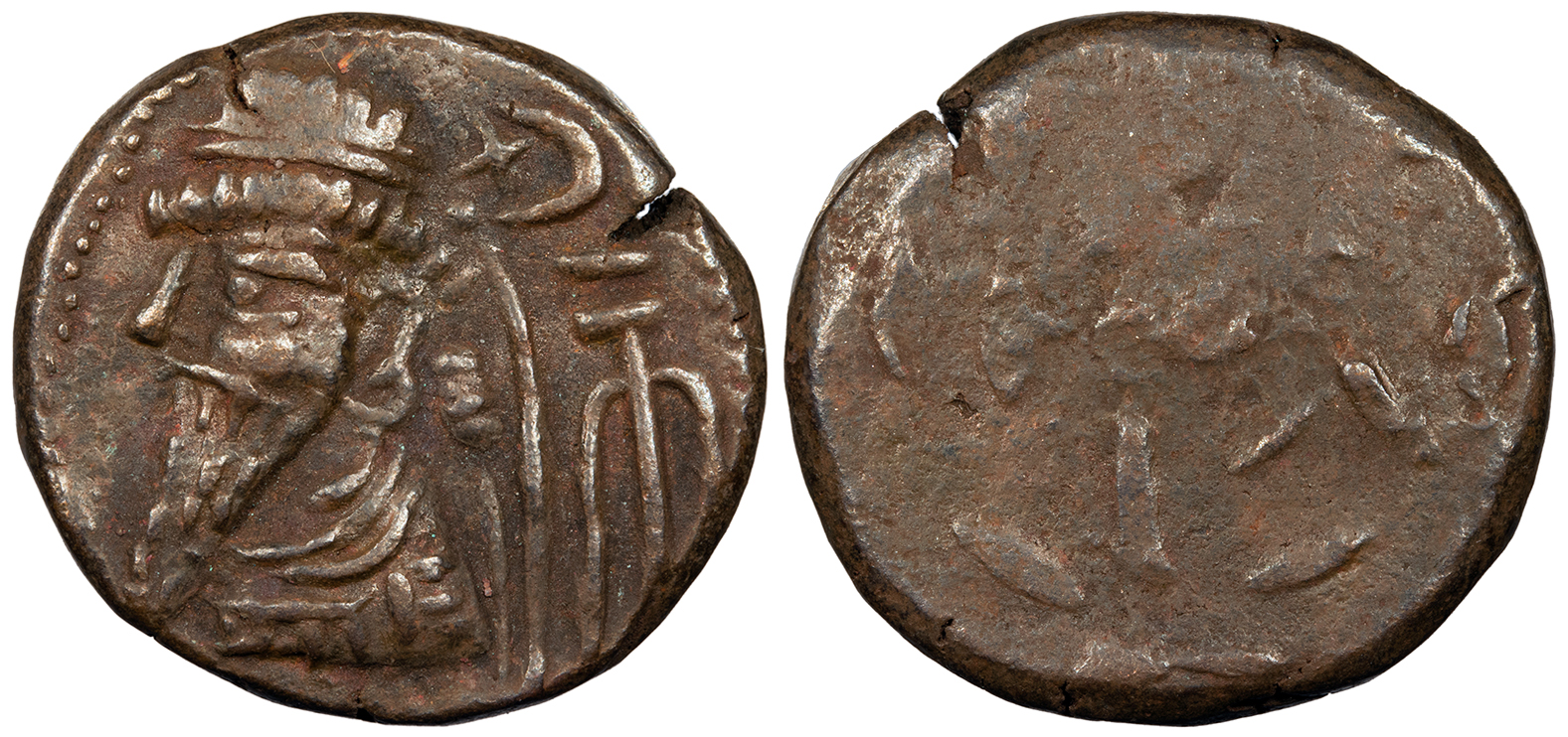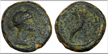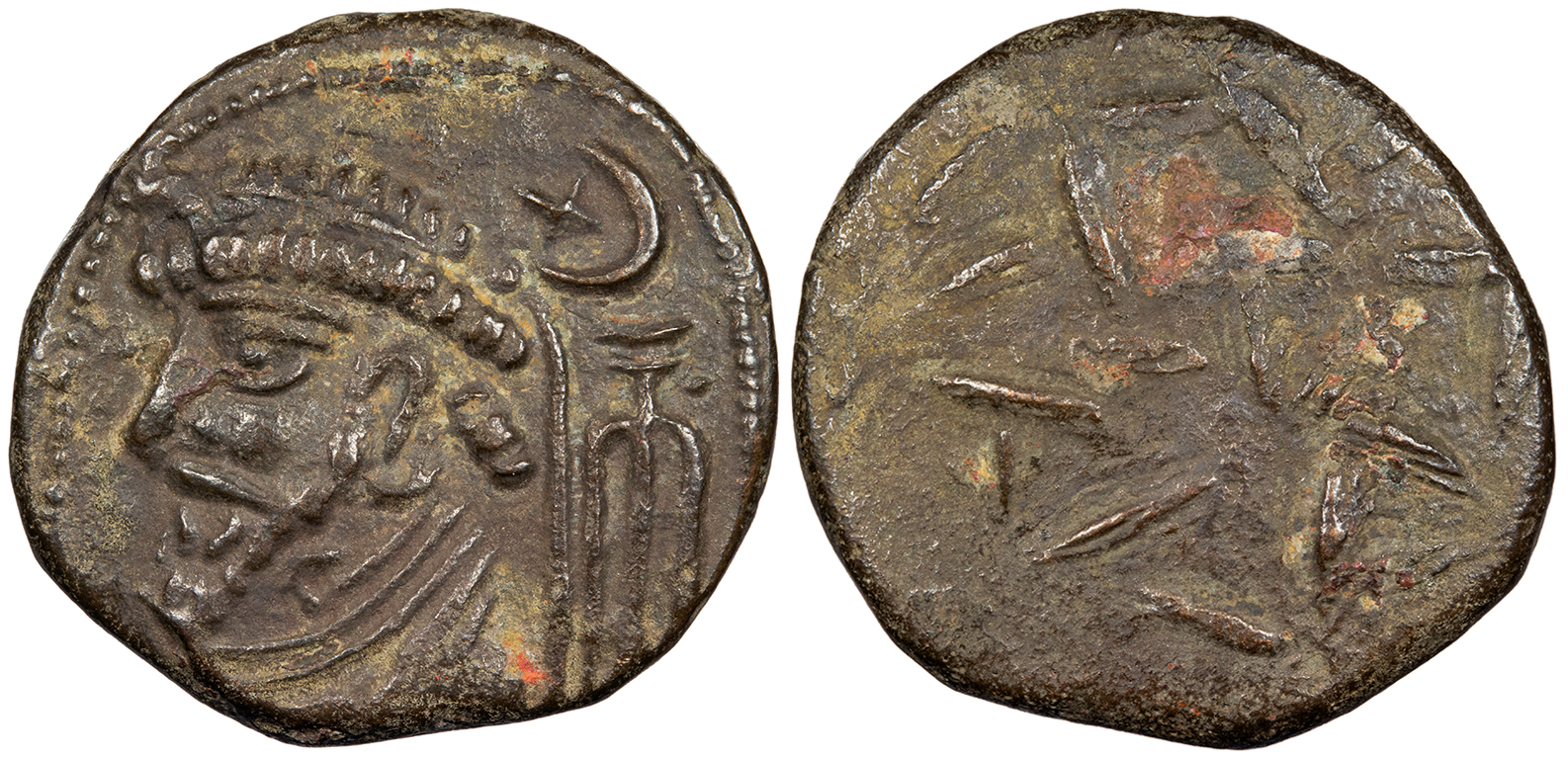 AE Tetradrachm 29mm. 12.25g. Bust facing, head slightly l., hair tuft on top of head and upward oriented hair on sides, anchor to r., dot between, crescent and star above; legend around.