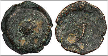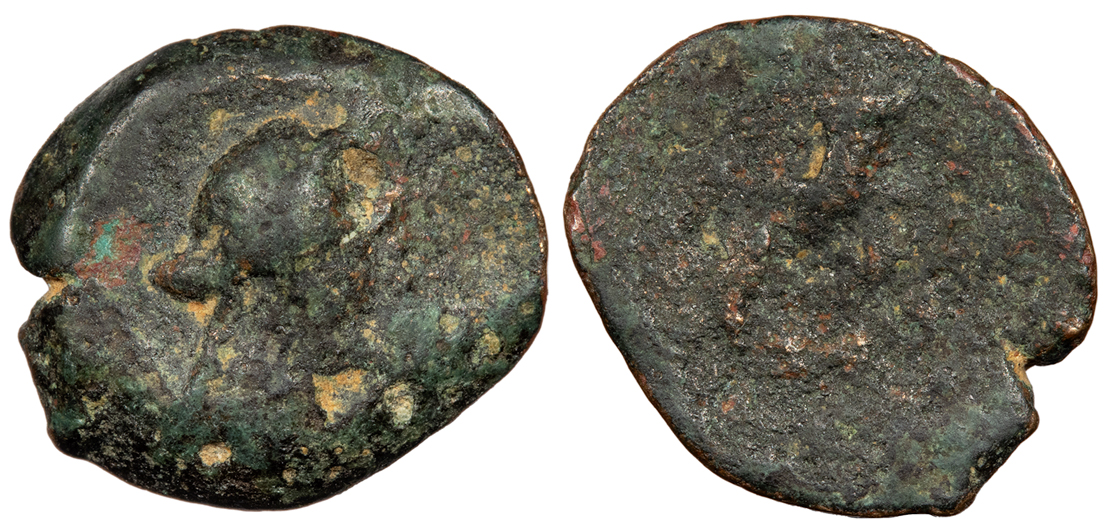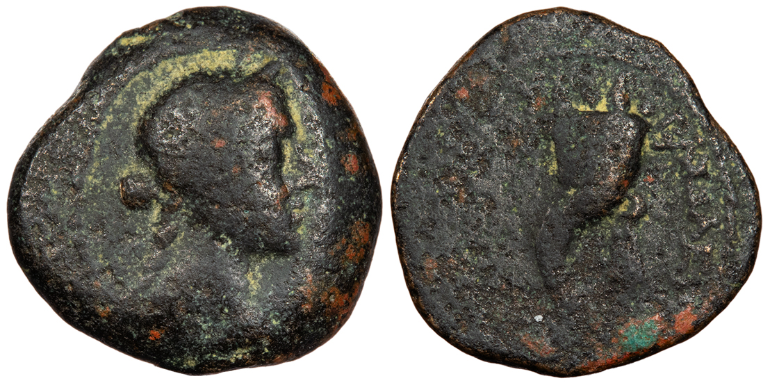 Double cornucopiae, ends of diadem falling on r. BASILEWS PTOLEMAIOU CPE B729-35; Svoronos 1160 var. Fine. Dark green patina. Moderate roughness. Crude. A late issue of the type with irregular flan. This type was once attributed to Ptolemy IV when it was believed to portray Arsinoe III. Later scholarship determined that the coin may portray Cleopatra VII, but that assertion has now been refuted. The abundance of these coins found on Cyprus and the lack of similarity to Cleopatra's typical portraits have led Lorber to reattribute the female portrait to Aphrodite of Paphos.