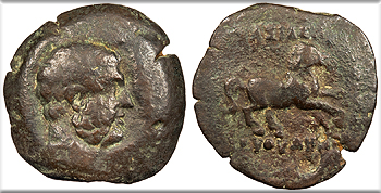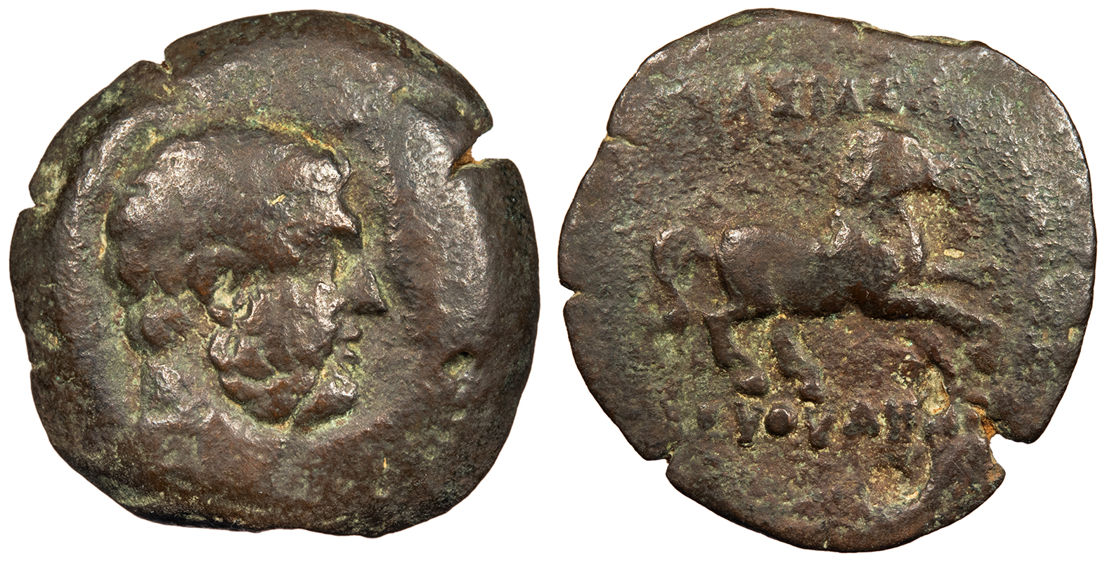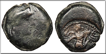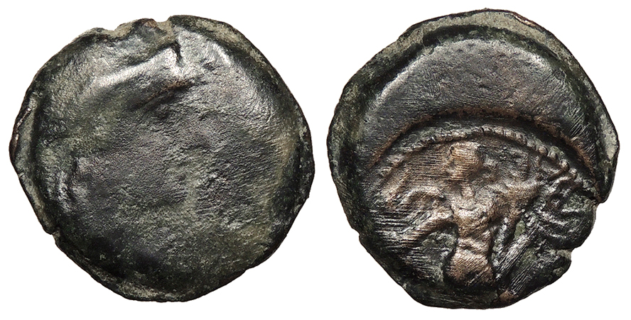 Horse galloping r. BASILEWS EUQUDHMOU HGC 12, 53 Good Fine. Dark brown patina. Some roughness.