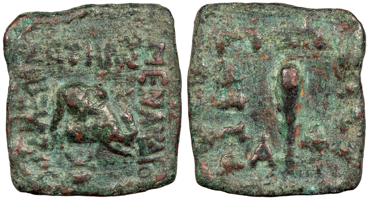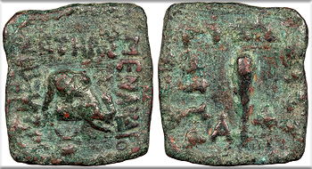 HGC 12, 146; Bopearachchi 19m Good VF. Nearly black patina. Some nice surfaces and better detail than most. Some minor small adhesions. Some trace smoothing in fields.