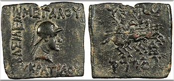 AE Quadruple Unit (Indian Standard) 24mm. 7.19g. Diademed and draped bust r., wearing crested helmet helmet adorned with bull's horn and ear. BASILEWS MEGALOU EUKRATIDOU Dioskouroi on horses rearing r., holding palms and spears; monogram to r. below horses; Karosthi legend above and below.