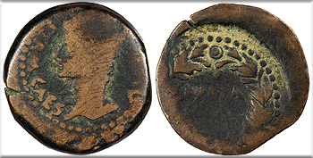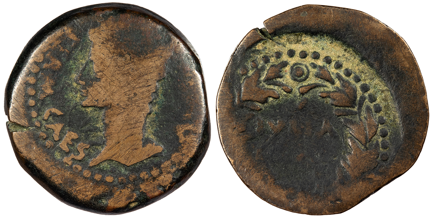 Uncertain host; countermarks: Pangerl 83 (AVG), 90 (TI.CAE), and 89 (TI.C.A) Good Fine. Mottled green patina. Unusual countermarks, some likely unofficial. Some roughness and corrosion, as expected. The host coin is probably an as of Augustus, as typical. The TI.C.A countermark on the reverse is believed to have been applied by Claudius. The TI.CAE with ligatured AE mark is believed to have been applied under Vespasian or Titus but both it and the AVG mark appear to be imitative and were likely applied unofficially.