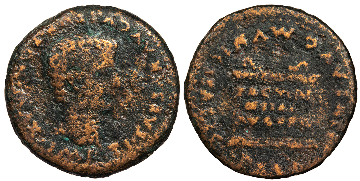 Host: cf. RPC I 4100 (Antioch) or cf. RPC I 2235 (Ephesos); countermarks: Pangerl 83 (AVG), 89 (TI.C.A.), 90 (TI.CAE), 98 (helmet), and 95 (dolphin) Fine. Glossy green patina. Scarce grouping of countermarks. Some light roughness, as expected. The host coin is uncertain (most likely an as of Augustus issued in Antioch or Ephesos), but was countermarked most recently in Moesia and Thrace under Vespasian or Titus. The TI.C.A countermark is believed to have been struck most likely under Claudius, and the dolphin most likely under Tiberius.