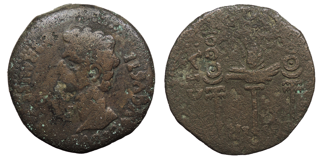 Host: RPC I 4100 (Antioch); countermarks: Pangerl 83 (AVG), 90 (TI.CAE), 98 (helmet), and 95? (dolphin) Fine. Mottled green patina. Scarce. A bit rough, with some light cleaning marks. The host is an as of Augustus struck in Antioch, Seleucis & Pieria, circa 27-23 B.C. but countermarked in Moesia and Thrace under Vespasian or Titus. There may be a softly applied dolphin countermark on the reverse (Pangerl 95), as is typical of this countermark combination.