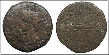 Host: uncertain; countermarks: Pangerl 83 (AVG), 89 (TI.C.A.),, 98 (helmet), and 95 (dolphin) Fine. Brown patina. Fairly clear dolphin countermark. Rough and porous. The host coin is uncertain (most likely an as of Augustus issued in Antioch or Ephesos), but was countermarked most recently in Moesia and Thrace under Vespasian or Titus. The TI.C.A countermark is believed to have been struck most likely under Claudius, and the dolphin most likely under Tiberius.