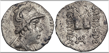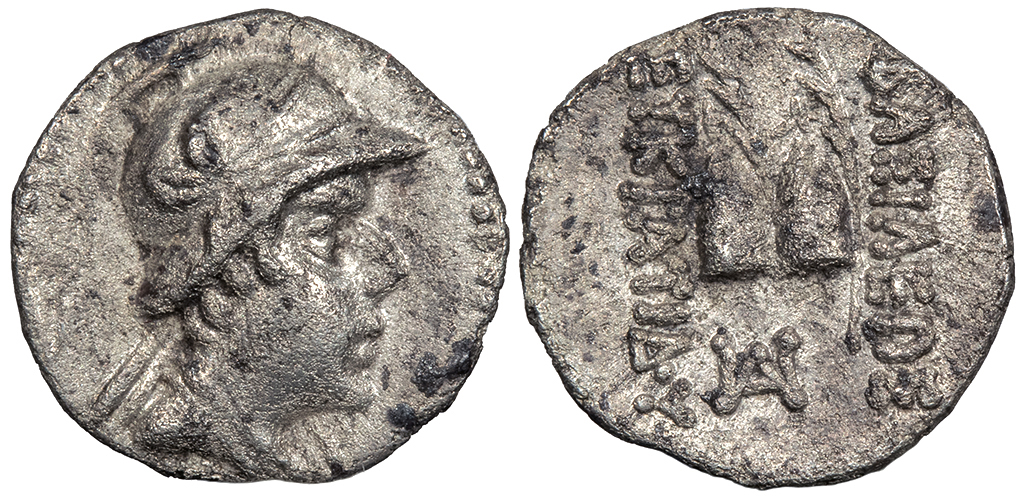 Palms and pilei of the Dioscuri; monogram below. BASILEWS EUKRATIDOU SNG ANS 9, 496ff. Near EF. Lightly toned with remaining lustre. Faint porosity and tiny adhesions.
