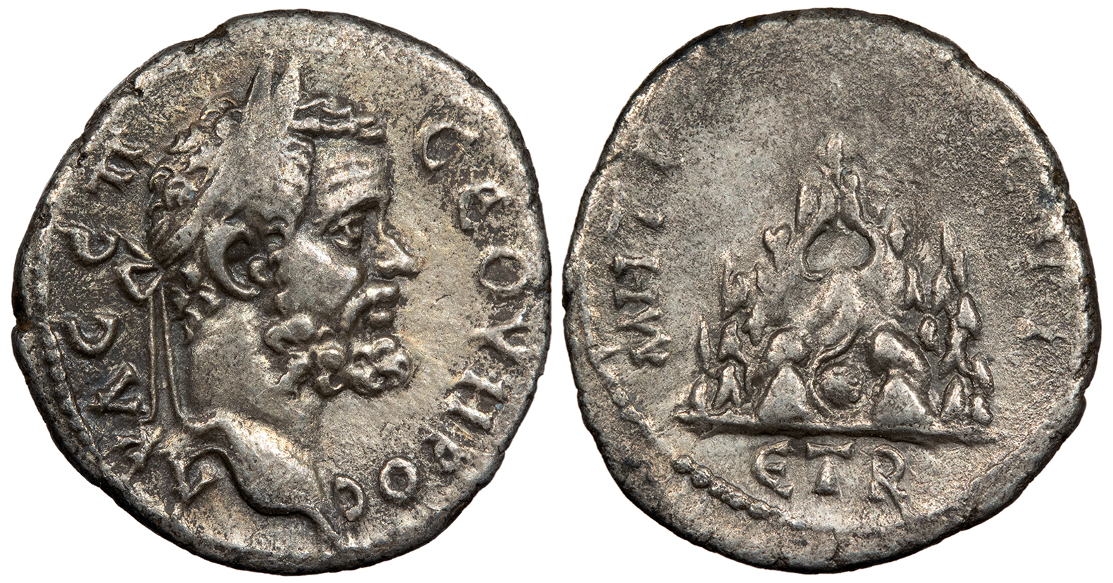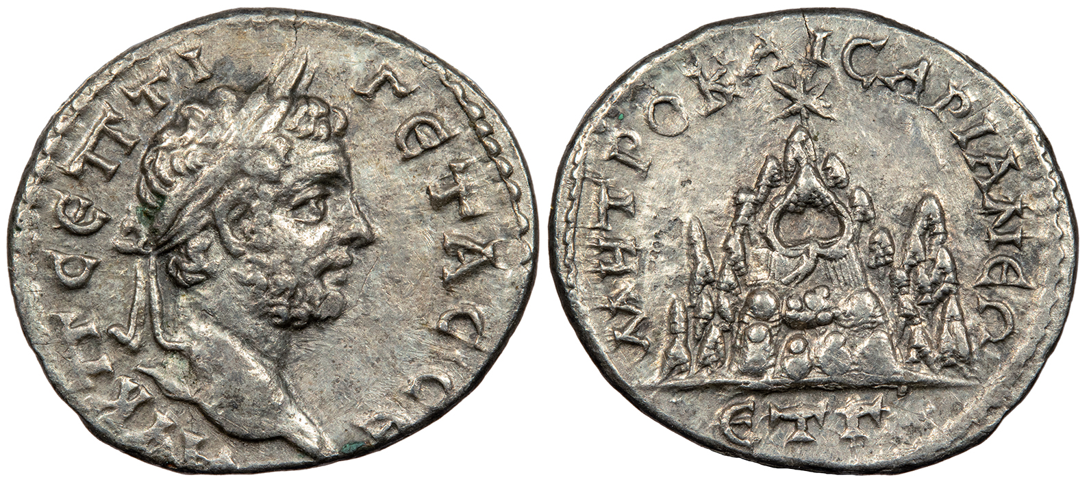 AR Drachm 18mm. 2.80g. RY3 (211 A.D.) Laureate, bearded head r. AV K P CEPTI GETAC CE Mt. Argaeus surmounted by star; In ex.: ETG (date) MHTRO KAICARIANEW SNG Copenhagen 276; Sydenham 499a EF. Very rare. Toned and lustrous. Choice detail. Some tiny porous spots. Some cleaning scratches. Far scarcer than the similar issue as caesar.