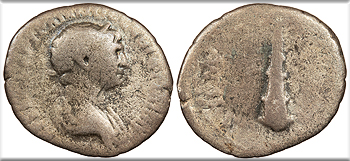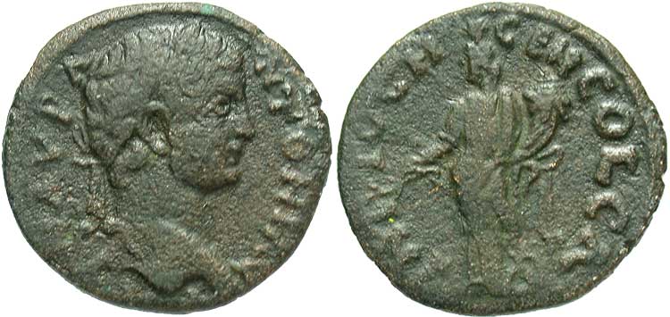 cf. RPC III 3705 or 3708; cf. McAlee 543a or 543d Fine. Very rare. Dark green patina with some reddish desert fill. Some minor roughness and area of patina loss on obverse. The officina letter is unclear, but both A and delta are listed as 'very rare' in McAlee.