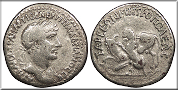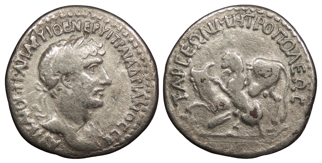 AR Tridrachm 25mm. 8.30g. Laureate head, r. AUT KAI QE TRA PAR UI QE NER UI TRAI ADRIANOS Lion attacking bull leaning l. TARSEWN MHTROPOLEWS SNG Copenhagen 355 Good Fine. Lightly toned with some trace lustre in legends. A few scattered light marks. Trace porous spots and roughness.