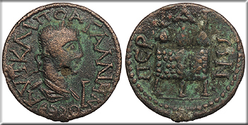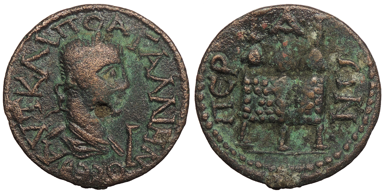 AE29 29mm. 16.10g. Laureate, draped bust r.; I before. AVT KAI PO LI GALLIHNO CEB Three-legged chest on which sits three prize urns (purses). PERGAIWN SNG Copenhagen 355; SNG Von Aulock 4725-6 VF. Seemingly scarce. Green patina with coppery high points. Attractive with clear legends. Flan void on bust. Some minor roughness and adhesions. Reduced from: $100