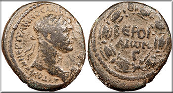 AE27 27mm. 13.50g. Laureate head, r. AYTOKP KAI NEP TPAINOC APICT [CEB GERM DAK PARQ] Legend in two lines, gamma below, within wreath. BEROI/AIWN RPC III 3429 Good Fine. Scarce. Dark brown patina with nice contrast. Obverse a bit off-center. Typical light roughness. Some corrosion on edge.