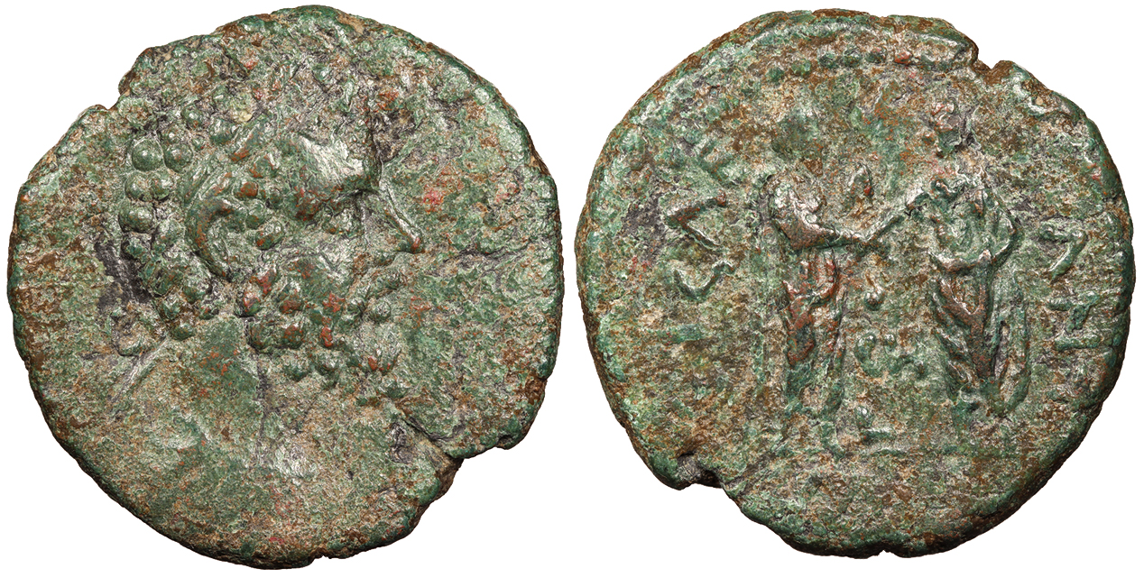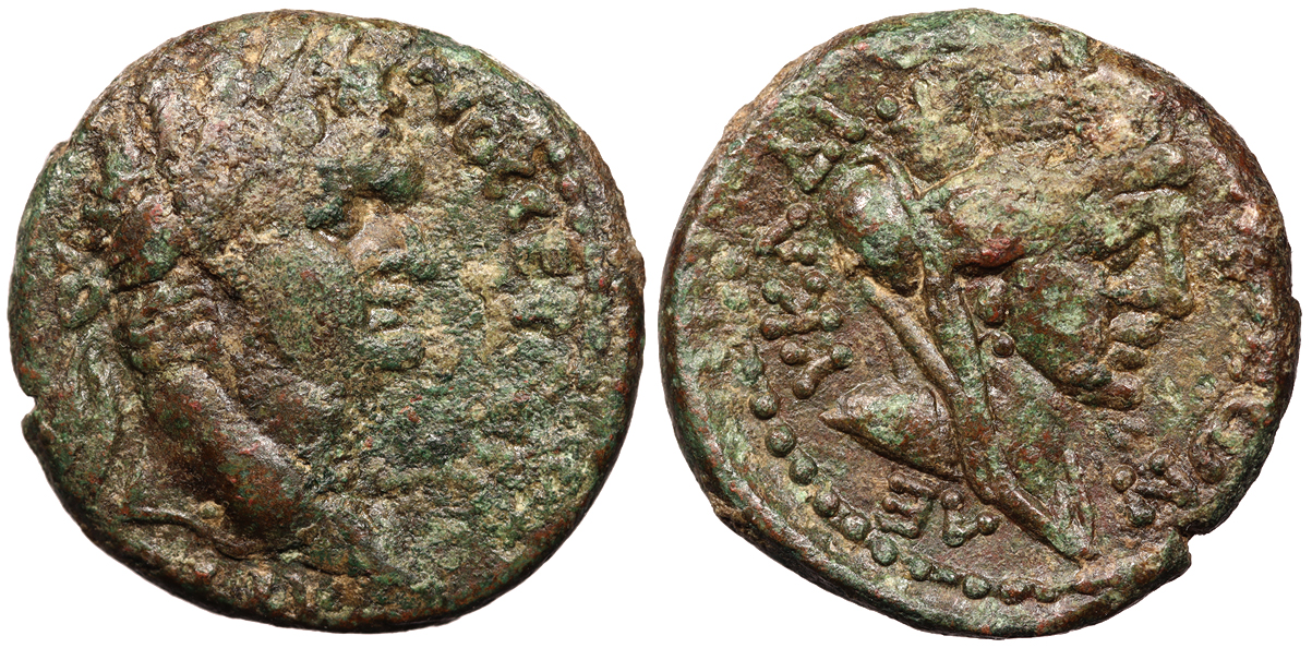 AE25 25mm. 8.40g. Year 188 (host coin, 140/41 A.D.) Laureate head, r.; countermark: laureate male head, r. (Antoninus Pius?) AVTO KAI TI AILI ADRI ANTWNEINOC CEB Turreted and draped bust of Tyche, l.; KO (?) to l., HPR (date) to r. IOVLIEWN TWN KAI LAODIKEWN RPC IV.3 online 8584; SNG Copenhagen 350; countermark: Howgego 113 About Fine. Scarce. Brown patina. Worn. Mild roughness. This issue is frequently found with this countermark. Interestingly, many of the sharper, less worn examples on the market lack the countermark. Howgego states that this countermark was applied after 143/4 A.D.