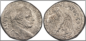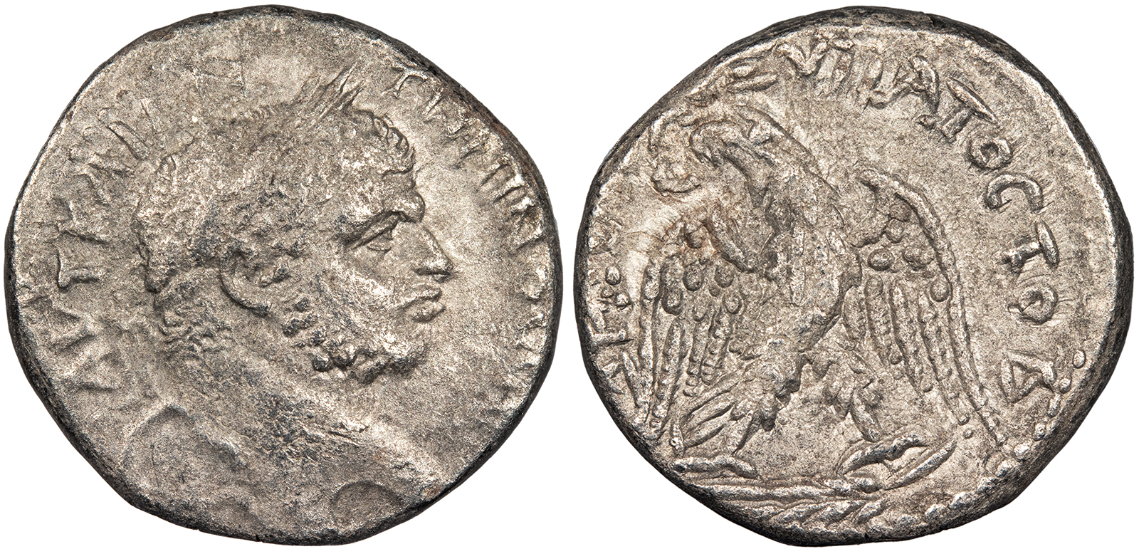 Bi Tetradrachm 25mm. 13.20g. Uncertain Mint 215-217 A.D. Laureate head, r. AUT KAI ANTWNINOS SE Eagle standing on ear of grain, head l. with wreath in beak. DHMARC EX UPATOS TO D Prieur 1578 VF. Scarce. Lightly toned with much remaining lustre. Typical light porosity. Obverse a bit weak, possibly from worn die. Reduced from: $140