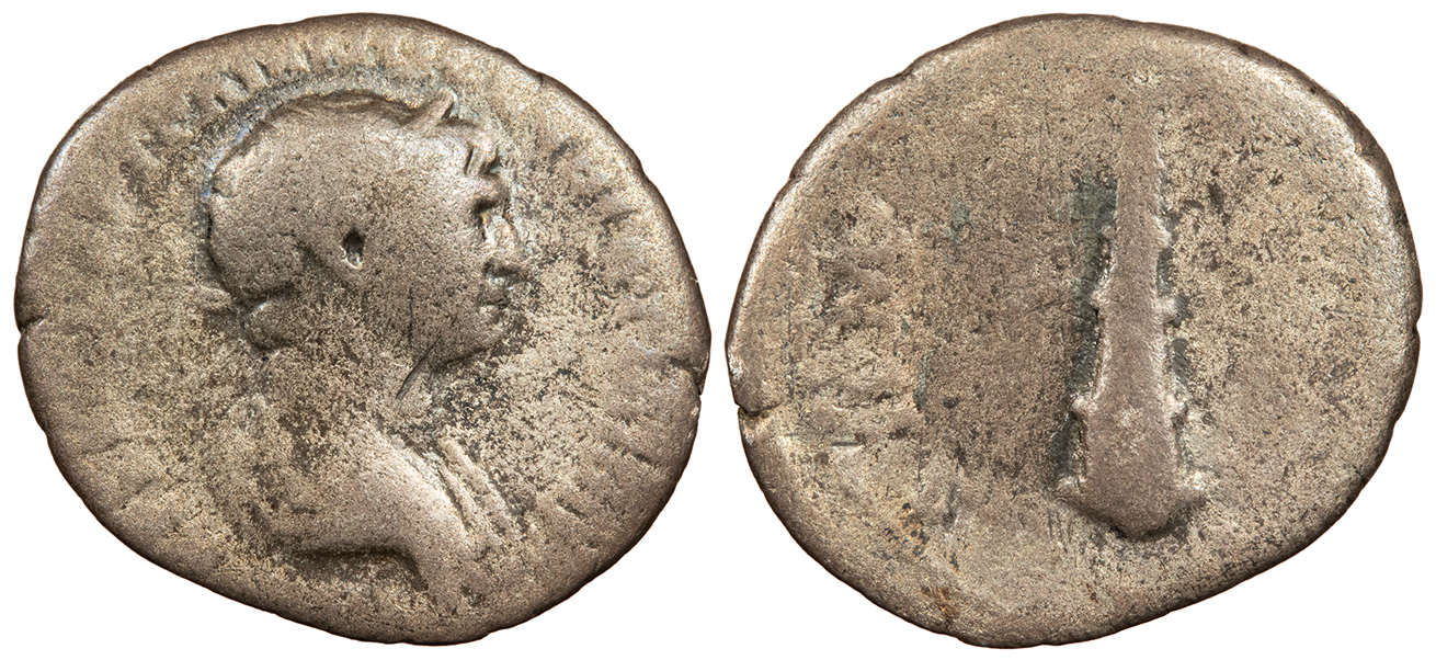 AR Drachm 20mm. 2.60g. 112-114 A.D. Laureate and draped bust, r. AUTOKR KAIS NER TRAIANOS SEB GERM DAK Vertical club, handle at top. DHMARC EX UPATO S RPC III 3024 About Fine. Rare. Deep toning. Worn. Minor porosity.