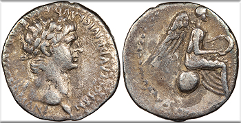 AR Hemidrachm 14mm. 1.70g. Laureate head, r. NERO CLAVD DIVI CLAVD F CAESAR AVG GERMANI Victory seated r. on globe, holding wreath.
