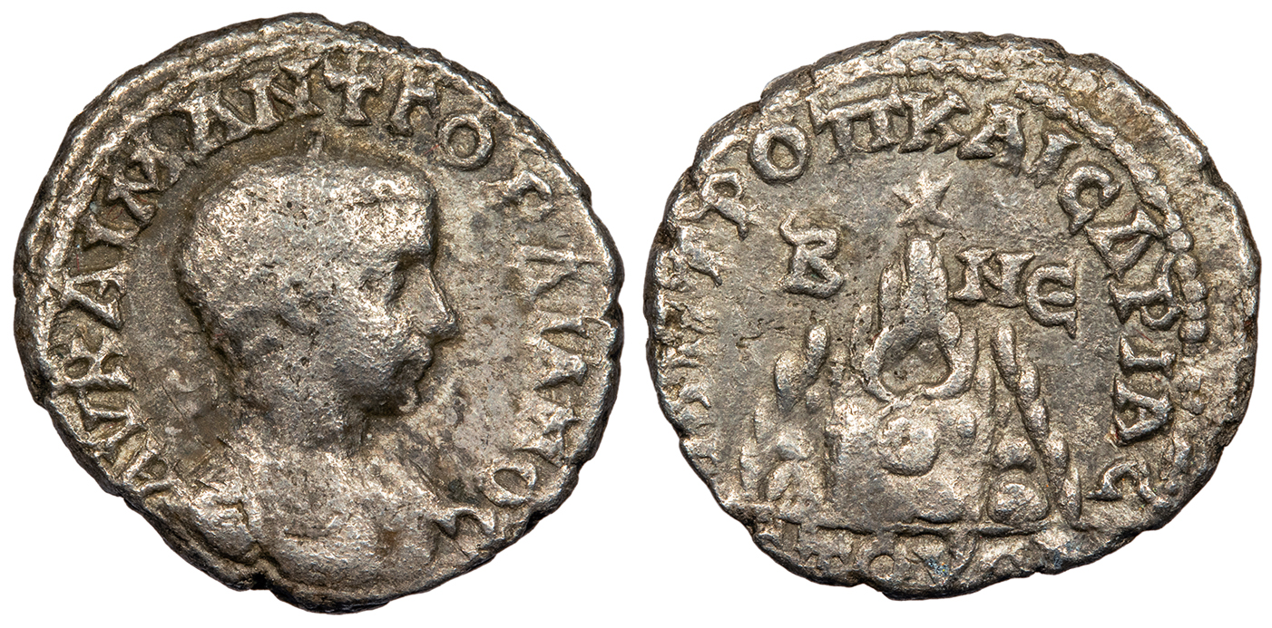 AR Drachm 18mm. 3.63g. Yr. 4 (241 A.D.) Laureate and cuirassed bust r., seen from front. AY KAI M ANT GORDIANOC Mount Argaeus, star above; B-NE across fields; In ex.: ETOYC (delta) MHTROP KAICARIAC RPC VII.2 3319 (online) Good Fine. Scarce. Toned. A few hints of lustre in legends. Mild porosity.