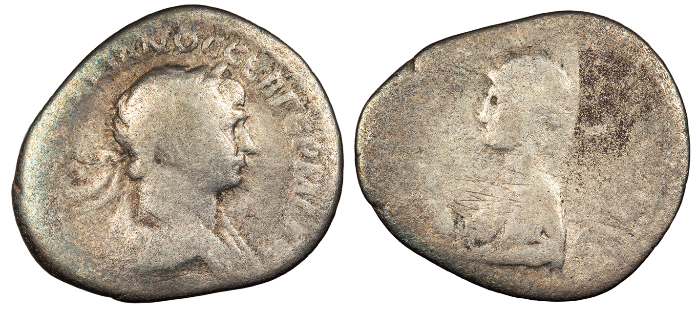 AR Drachm 20mm. 2.60g. Caesarea mint 112-114 A.D. Laureate and draped bust r., seen from behind. AYTOKP KAIC NEP TRAIANOC CEB GERM DAK Female bust (Artemis?) in chiton, holding spear and patera. DHMAPX EX YPATO S RPC III 3004 VG. Toned with a hint of lustre around bust. Worn. Light porosity.