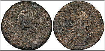 AE Æ24 24mm. 8.60g. Laureate head, r. [AUT]O ANTONEINOC [CEB EUCBAIC] Tetrastyle temple, colonnaded peribolos containing grove before; uncertain control letter in inner r. field; all within laurel wreath. ZEUGMATEWN RPC IV.3 (online) 10693 Fine. Seemingly rare, especially with right-facing portrait. Dark gray patina. Light porosity. The dark silvery gray patina and fine porosity seems to indicate this example may be billon.