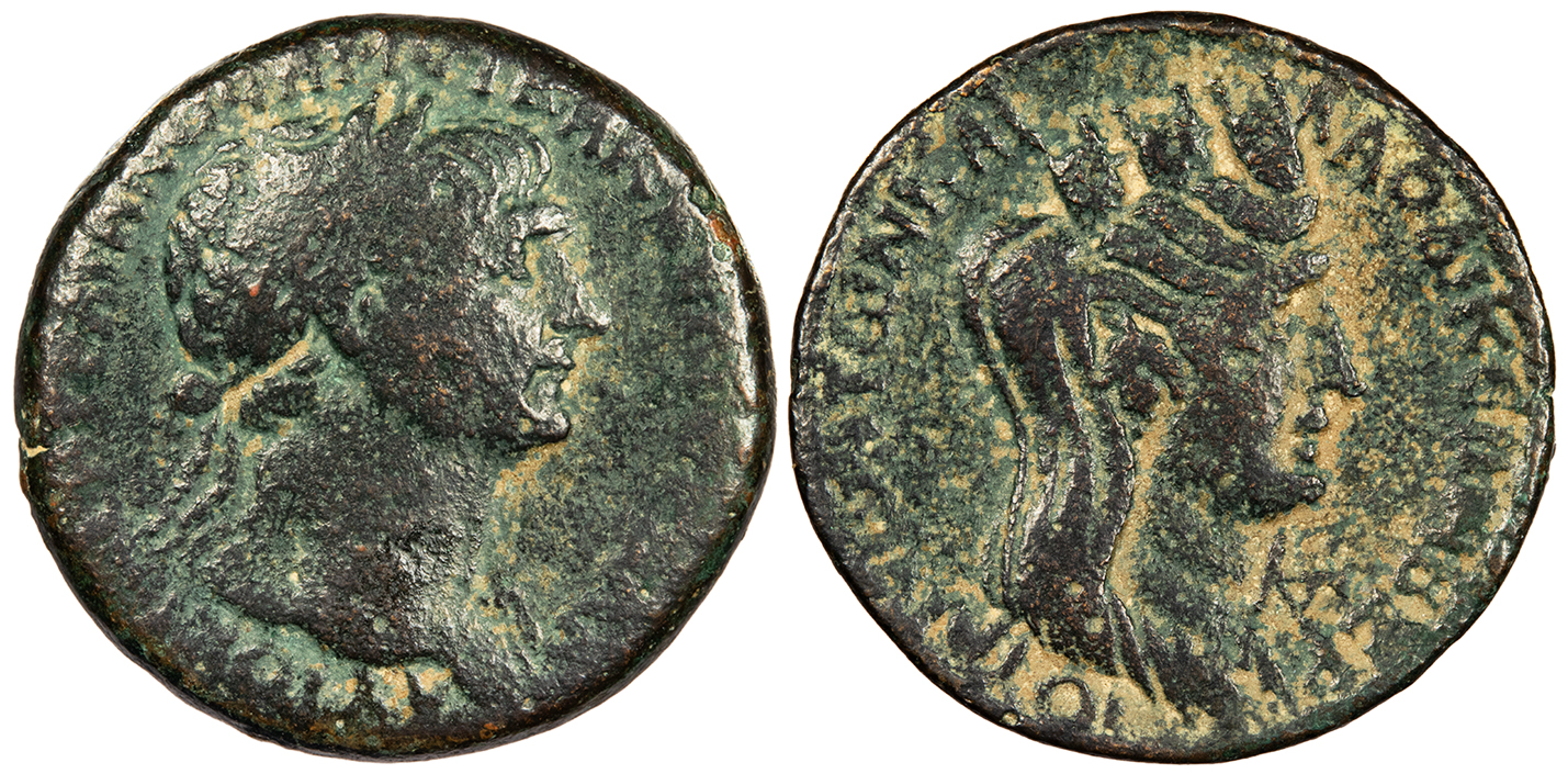 AE25 25mm. 9.00g. Year 162 (114/5 A.D.) Laureate head, r. AUTOKR NER TRAIANOC ARICT KAIC CEB GER DAK Turreted and veiled bust of Tyche, r., monogram in r. field. IOULIWN TWN KAI LAODIKEWN BXR RPC III 3795 About Fine. Dark green patina with some earthen fill. Light roughness.