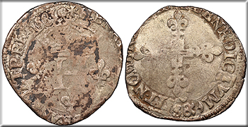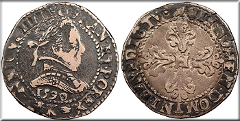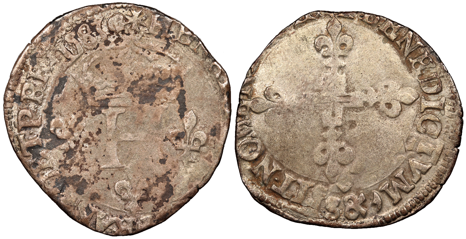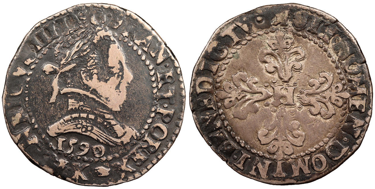 AR Demi-Franc 29mm. 6.98g. Bordeaux Mint. 1590 Laureate and cuirassed bust right; date below. :HENRICVS. III. D (MG) G. FRAN. ET. PO REX -K / 1590 Cross fleuronée centered with 'H' monogram. K (retrograde) :SIT. NOMEN. DOMINI. BENEDICTV. Duplessy 1190; Lafaurie 1037 Near EF. Deeply toned. Rare variety with date at shoulder of bust. Six mints, including Bordeaux, continued to strike coins in the name of Henry III for part of the year 1590. Listed as unique by Duplessy, though a handful of examples are known in recent auction records. Includes old collection envelope/ticket. Envelope reads 'Bought in Paris April 1954' Henri III died in 1589. The 'League' opposed the coronation of Henry IV, a protestant, and preferred Charles, Cardinal de Bourbon and uncle of the king, but Charles died a prisoner of his nephew in 1590. Numerous workshops continued to monetize the name of the deceased king Henri III well after his death. The coinage of the Leaguers in the name of Henri III stopped when Toulouse fell into the hands of Henri IV, 24 January 1596. Reduced from: $290