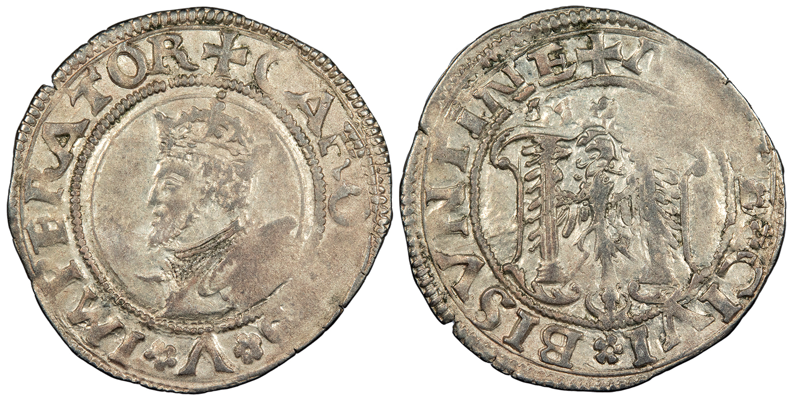 AR Blanc (1/2 Karolus) 18mm. 0.90g. Besançon Mint 1538 Crowned bust left; annulet behind head. +CAROLVS: V: IMPERATOR Arms; date above. +MONE: CIVI: BISVNTINE: Roberts 7005; Poey d;Avant 122.19 EF. Highly lustrous. Flan slightly bent and clipped.