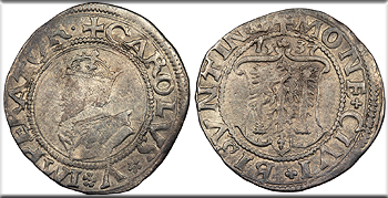 AR 2 Blanc (Karolus) 23mm. 1.94g. Besançon Mint 1537 Crowned bust left. CAROLVS V IMPERATOR Arms; date above. +MONE CIVI BISVNTINE Roberts 7003; Poey d;Avant 122.13 Near EF. Scarce one year type. Bold portrait. Lustrous fields. Areas of weak strike.