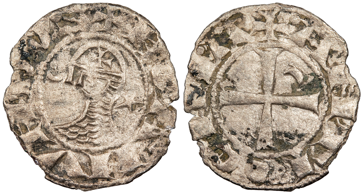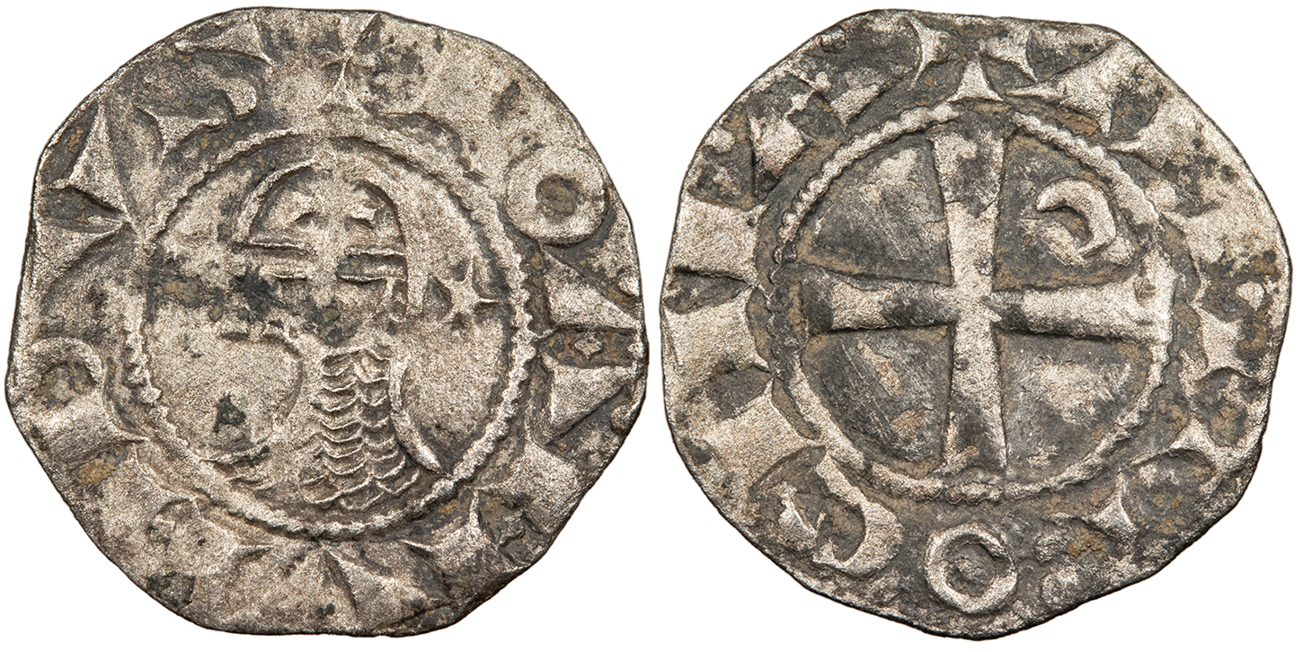 Bi Denier 18mm. 0.76g. Helmeted bust l., in mail coat, cross on helmet; crescent before, star behind. +BOANVHDVS Cross pattée; crescent in 2nd quadrant. +ANTI:.OCHIA CCS 69 Good VF. Well struck. Minor adhesions. Type noted by double cross-bars on 'N' and 'H' and 4-pellet 'A' and trefoil in reverse legend.