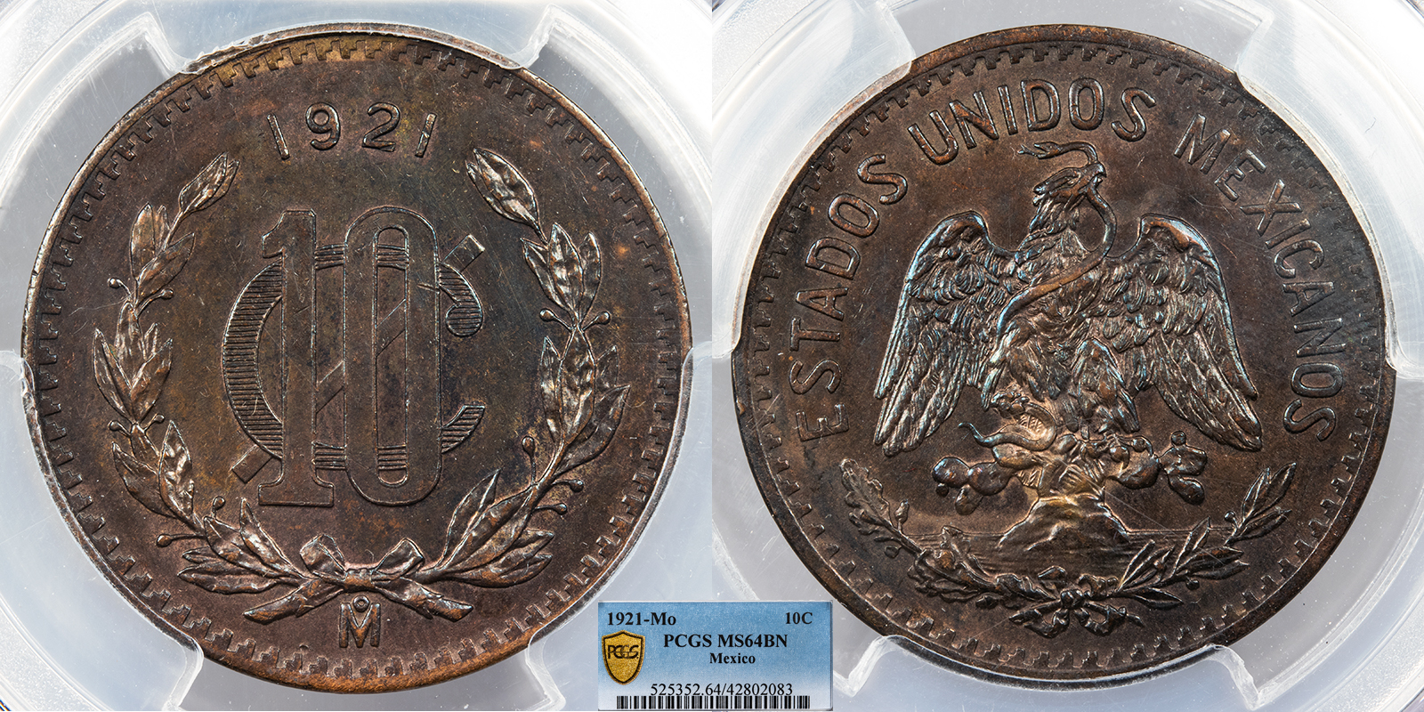 MEXICO 1921-Mo 10 Centavos PCGS MS-64 BN -- #WC94349