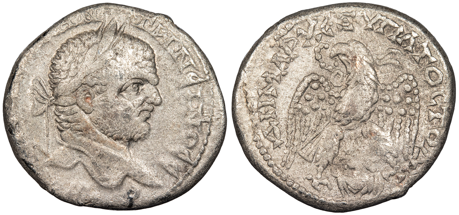 Bi Tetradrachm 29mm. 13.00g. 215-217 A.D. Laureate head, r. AUT K M A ANTWNEINOS SEB Eagle standing with wings spread, head r. with wreath in beak, star over crescent between legs. DHMARC EX UPATOS TO D McAlee 688; Prieur 235 VF. Lightly toned with much remaining lustre. Typical porosity. A bit rough due to poor strike.