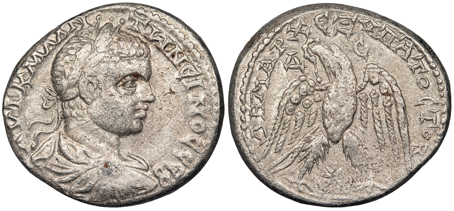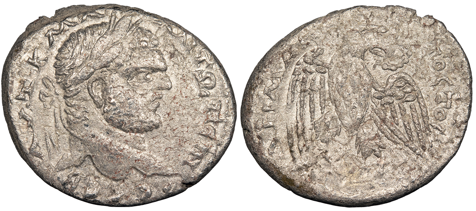 Bi Tetradrachm 26mm. 11.90g. 215-217 A.D. Laureate head, r. AUT K M A ANTWNINOS SEB Eagle standing wings spread, head l. with wreath in beak, radiate and draped bust of Sol or Shamash between legs; O below beak. DHMARC EX UPATOS TO D Prieur 1000 Good VF. Lightly toned with some lustre in devices. Typical light porosity. Some friction on high points.