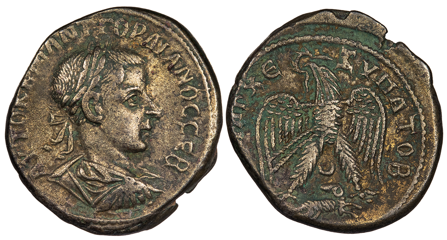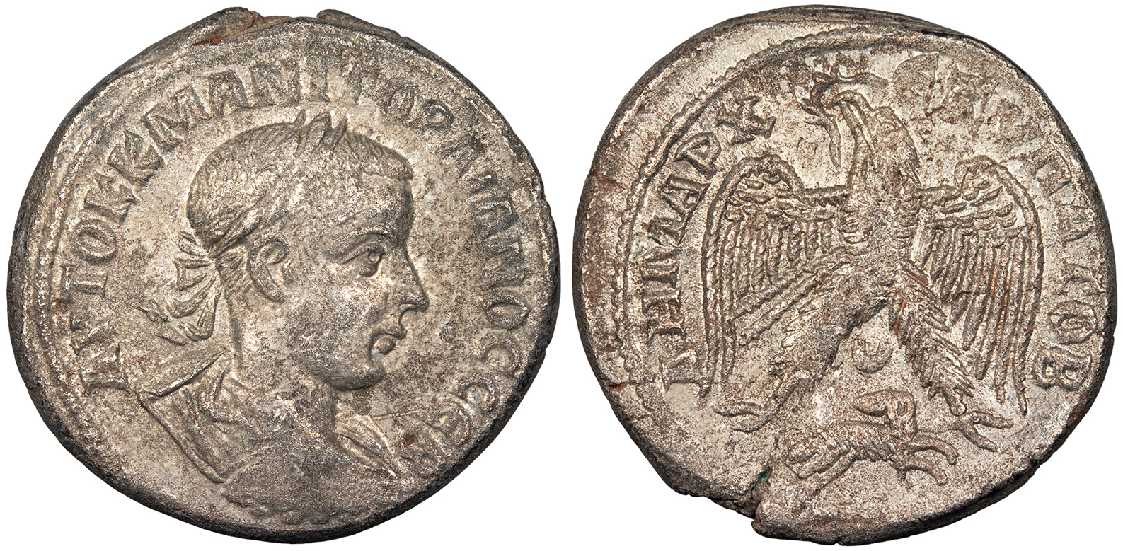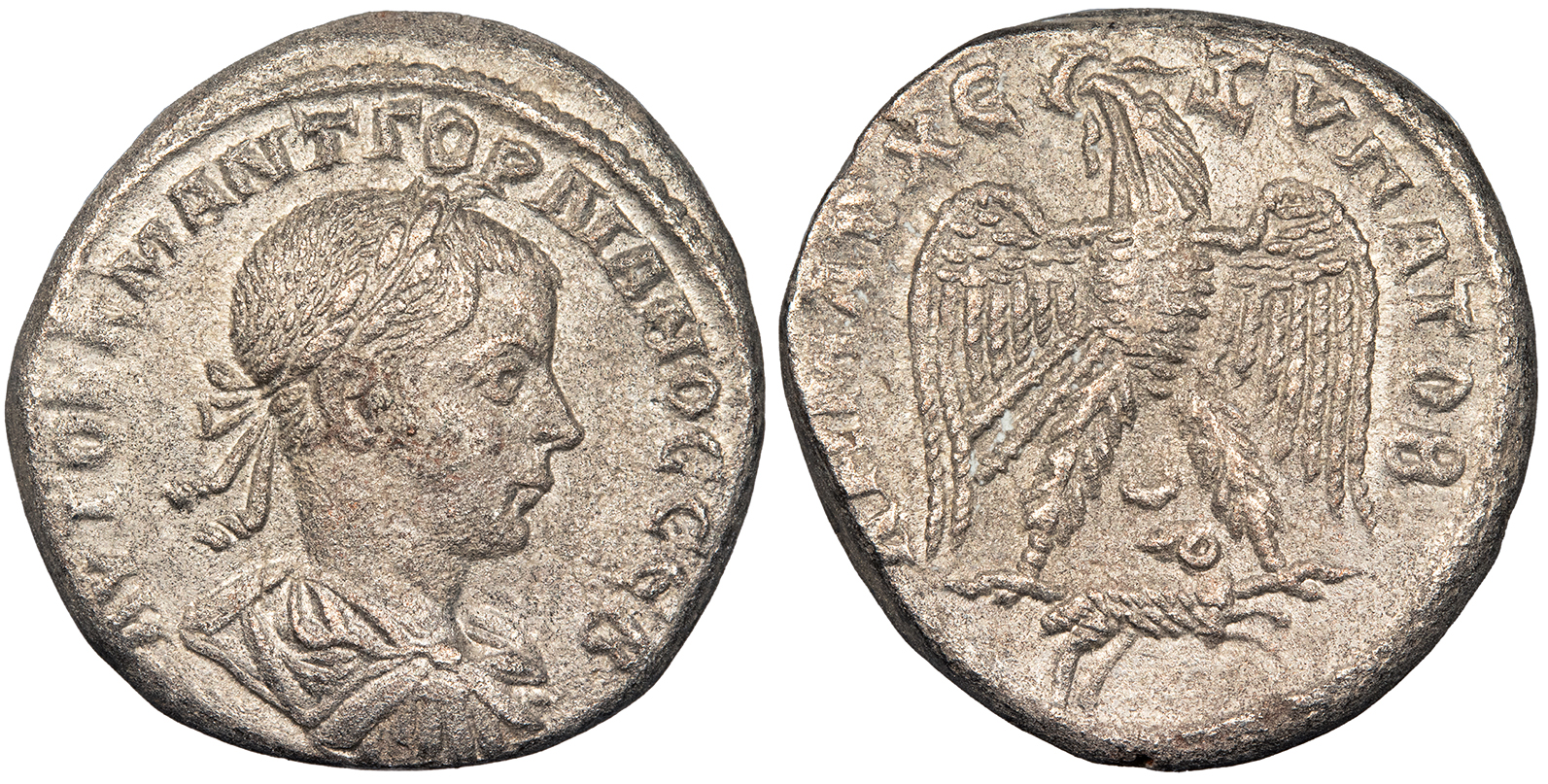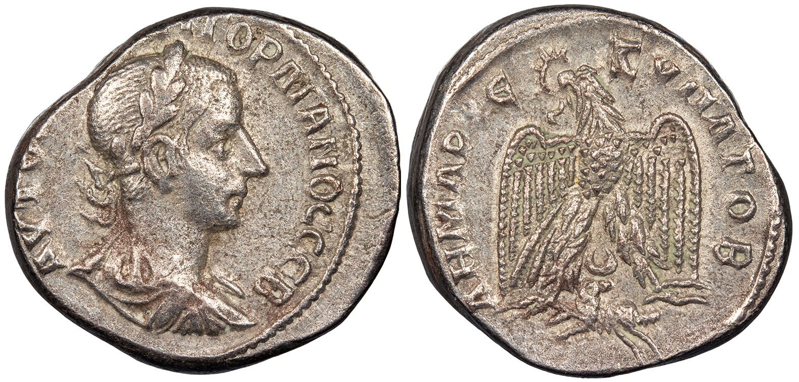 Bi Tetradrachm 26mm. 11.50g. 241-244 A.D. Laureate, draped and cuirassed bust, r., seen from behind. AUTOK K M ANT GORDIANOS SEB Eagle standing facing, wings spread, head l. with wreath in beak; between legs, ram running l. under crescent. DHMARC EX UPA TO B McAlee 872; Prieur 295 Good VF. Lightly toned with much remaining lustre. Reverse a bit double-struck. Typical light porosity.